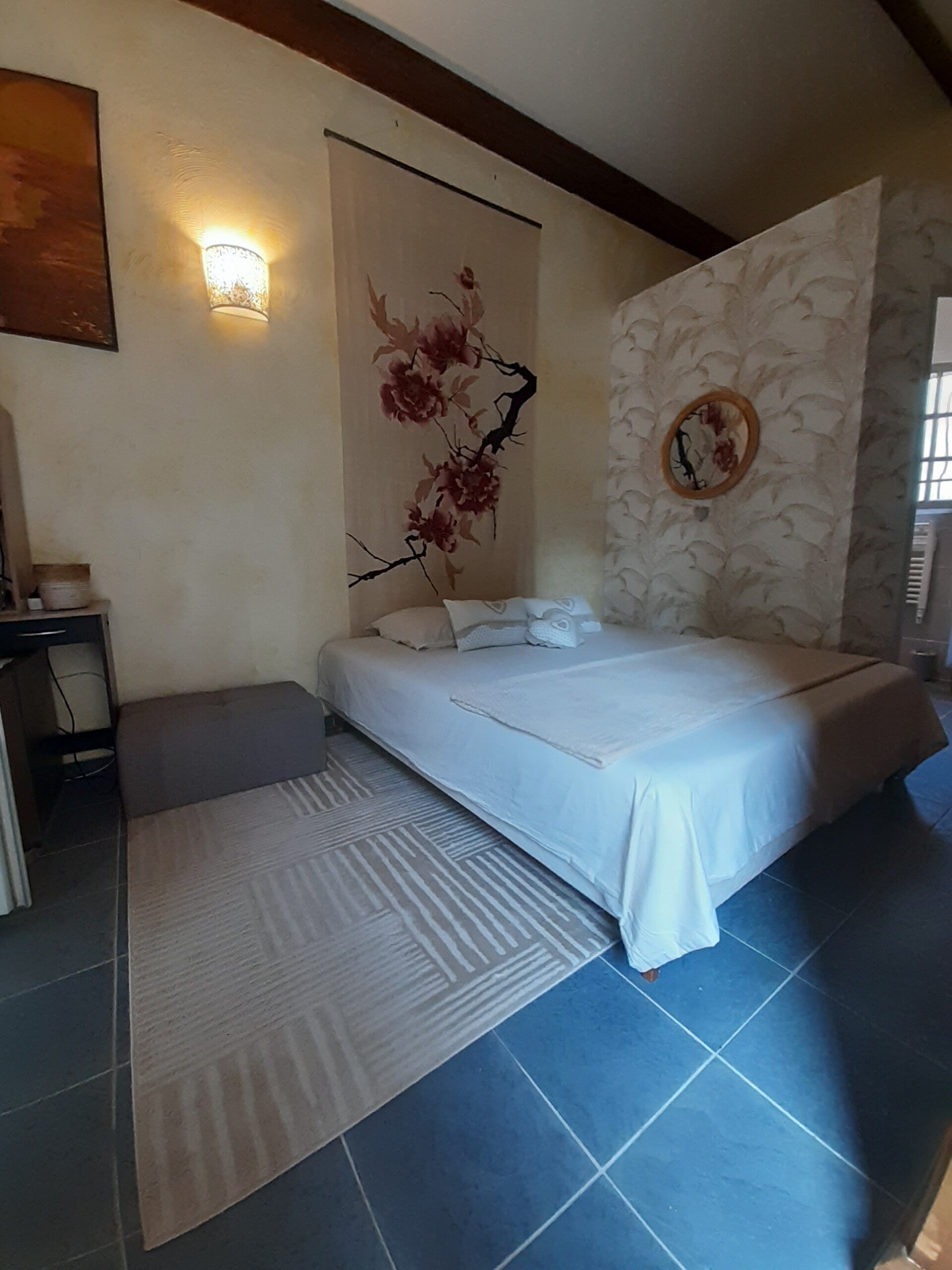 Nous vous proposons une charmante chambre totalement indépendante, pensée pour votre intimité et votre bien-être. Profitez d'un lit 180X200 à mémoire de forme pour des nuits réparatrices. Une salle de bain complète avec WC et lavabo est à votre disposition, ainsi qu'une climatisation réversible pour un confort optimal en toute saison. Vous trouverez également un réfrigérateur pour vos rafraîchissements.